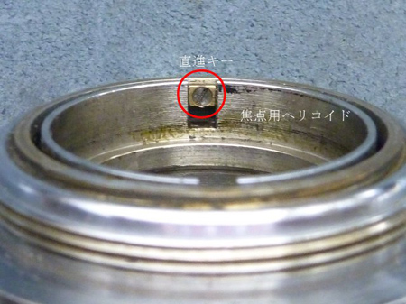 取り外した直進キーは同位置に戻すのが原則です。又、ネジの締め付けで直進キーが傾きますのでヘリコイドを回転させ様子を見ながら両直進キーのネジを徐々に締め付けて行きます。