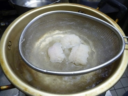 鳴門鱧を湯引きしているところです。湯に潜らせる湯引きは旨みが逃げてしますと徳島の大将から教わり、笊を用いて皮の部分のみを沸騰している湯に当てます。