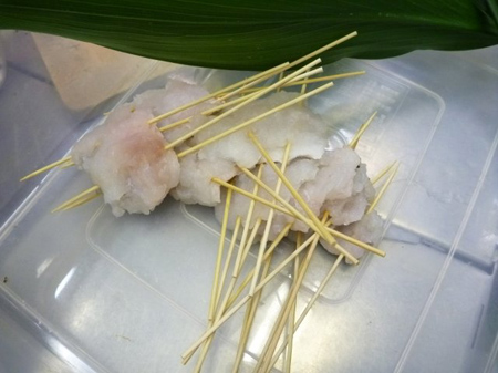阿波国蕎麦友さん串打ちをした鱧。隠居人始めて味わいます鱧焼きとなります。