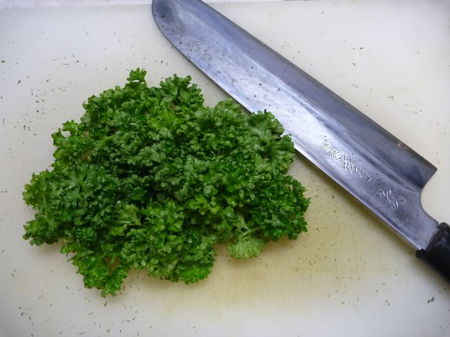 パセリは大匙3杯分微塵切りにします。隠居人My包丁、京都有次の切れ味は良いです。