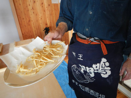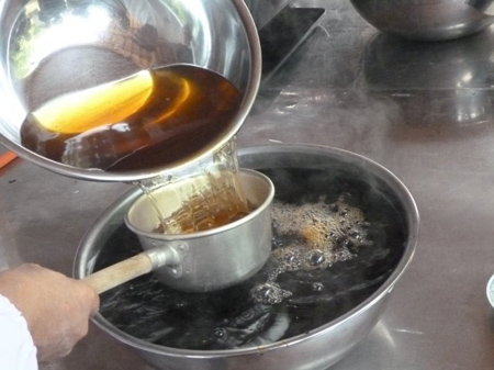 本枯れ節・鯖節・宗田節の厚削りで出汁を取り、そば膳・昔仕込み味醂・きび砂糖の返しと合わせているところです。各自ペットボトル1本分を土産とし、自宅で名店の味を味わう事でしょう。