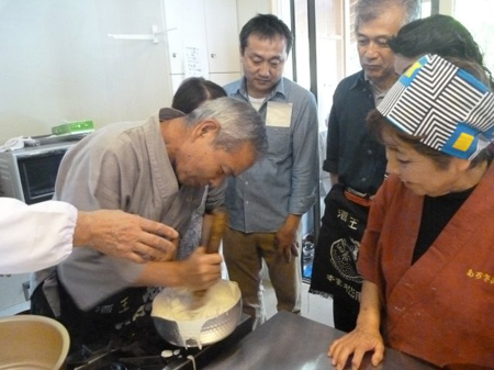 蕎麦掻きの指導を受けている隠居人です。艶をだし、舌触り良く仕上げるには掻き棒をこれでもかと回さねばなりません。