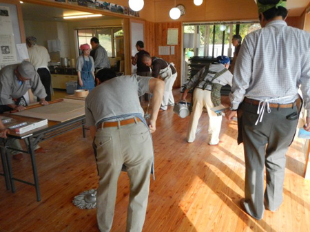 立つ鳥跡を濁さず、が大事です。お世話になりました会場の掃除を念入りに致しまし、会場を背景に記念撮影して解散です。 宮澤先生と有志は番外連泊をすべく磯辺温泉の湯に浸かりに参ります。 合宿は幾つになりましても楽しいものですね!