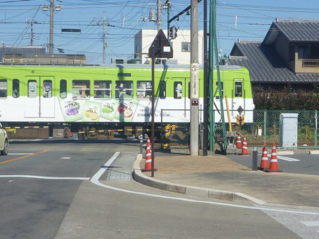 踏切の警報機がリズミカルな音を醸し出し、始めて出会う上信電鉄の車両が通過します。