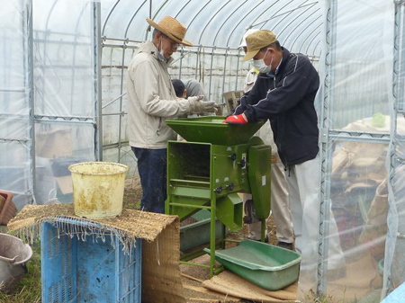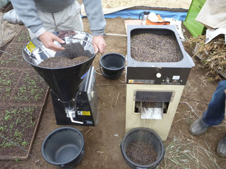 右側の機械が石抜き機、何故か?小石が紛れ込みます。この後の機械破損を防ぐべく石小石を取り除きます。