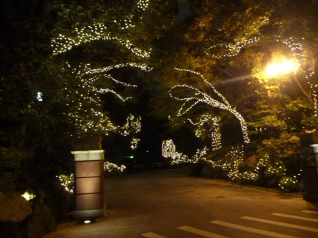 立木が電飾されクリスマス気分です。陽が落ちましても暖かさが続いている日でした。