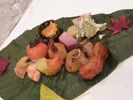 鳴門金時・銀杏・栗・麩・合鴨ロース・茸・白和合の前菜。
