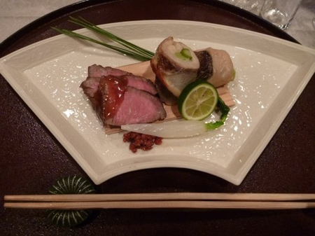 焼き肴八寸:国産牛ロース龍田焼・かます・生野菜添え。