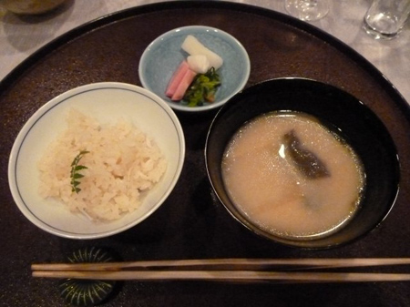 食事:鯛飯・粕汁。大吟醸の酒粕を使用しています。家庭で作ると酒粕を多く使いがちです。友人が「この按配なのか!」お互いが、相共存する割合が大事なのですね!