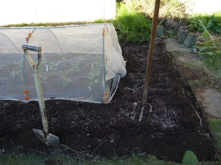 ソラマメは倒伏防止に防虫布を張ってあります。寒さにめげずスナップインゲン・キヌサヤも僅かずつですが成長をしているようで何かに絡まろうとツルを延ばしていました。
