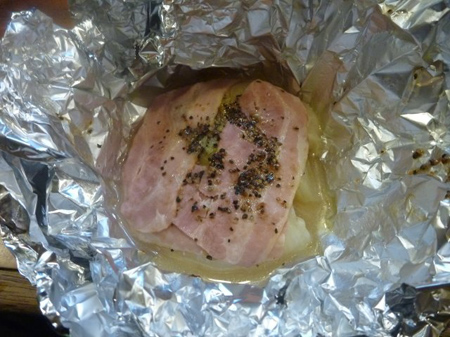 新玉葱丸ごとにベーコンを巻き、粗挽き黒胡椒で風味付けしアルミホイルで三重に包みます。時間を掛けて真っ赤に怒った備長炭上で蒸し焼きにします。