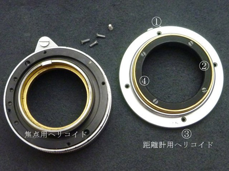 レンズマウト部の4本ネジを外しますと焦点用と距離計用のヘリコイドに分かれます。