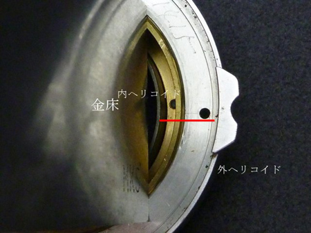金床をレンズマウト裏面に置きます。内ヘリコイドを回転させると金床に接し外ヘリコイドと面位置になります。製造時でしょうか?その後でしょうか?両者に罫書きがありました。