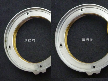 レンズマウント(外ヘリコイド)の内側に汚れが見られます。再組み立ての際に不都合が起きる可能性があります。薬品で錆・汚れを清掃します。