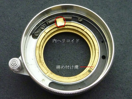 緩めている際に締め付け環が内ヘリコイドにあるキー(赤○部)に妨げられてしまいますから内ヘリコイドを手前に引き上げながら分離します。