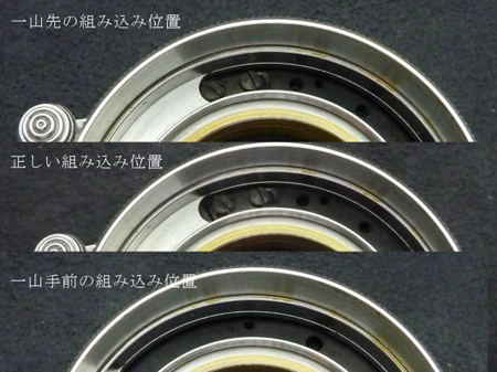 1)正しい線条位置から一山先で組み込むと無限位置係止板で止まらず無限位置係止板を固定しているネジで止まりました。