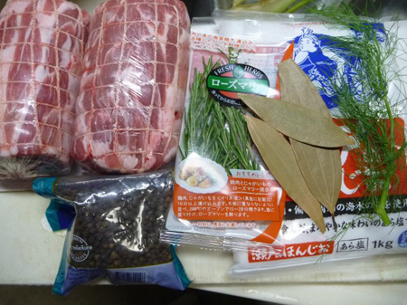用意したのは、豚のもも肉1Kg・瀬戸の本塩1Kg・ローズマリー・ローリエ・黒胡椒に埼玉菜園で育てたフェンネルを使用します。