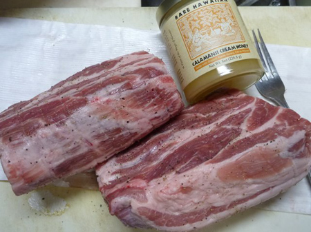 フォークで肉をブスブス刺します。黒胡椒を振り掛けハワイ産白蜂蜜を擦り込みます。