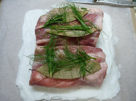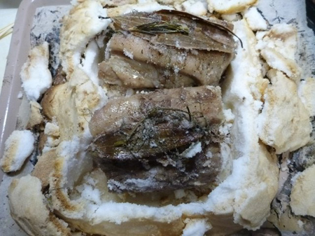 瀬戸の本塩に白身を混ぜて床を作った上に豚肉を乗せ、ローリエ・ローズマリー・フェンネルを載せます。