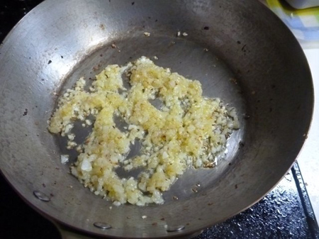 玉葱1/4の微塵切りをオリーブオイルでキツネ色になるまで炒めます。