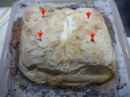 オーブンへ入れる前に確認用の穴を計4ヶ所開けておきました。