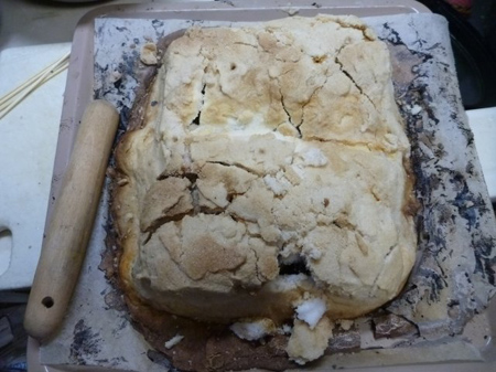 粗熱をとりますと塩釜は固くなります。麺棒で叩いて塩釜を壊します。
