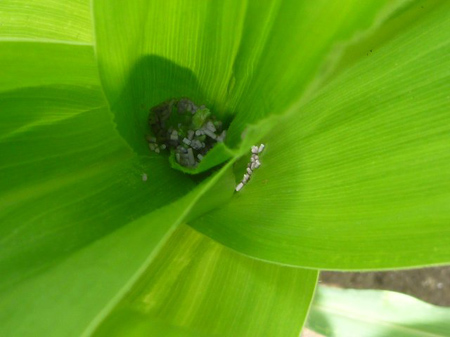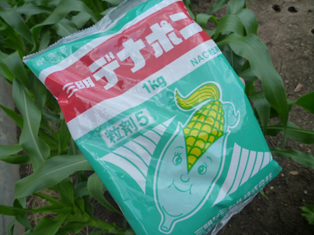 雄花と葉の元に薬剤をパラパラと振ります。トウモロコシの大害虫アワノメイガ。先ず雄花に卵を産み付け、幼虫は芯を食害し雄花を枯らせます。枯れれば花粉を作る事が出来なくなり、雌花は受粉する事が出来ず、実は肥大しないのです。