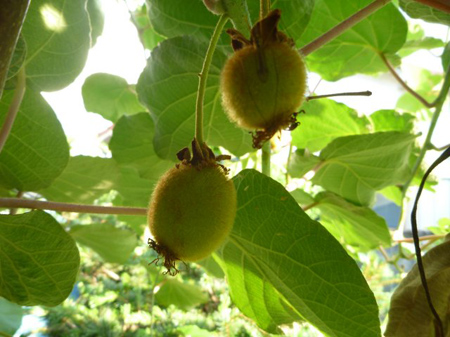 キウィの実が肥大過程です。昨年も数がなりませんでした。今年の実付きも良くありません。剪定の失敗か?です。