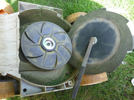 途中で回転に異音を感じます。分解すると回転軸に枝が入り込んでいました。 序ですので回転刃を目立て致します。切れ味よくなりました。