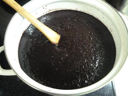 桑の実の総重量を量れませんから、大凡の重量を見極め使い残しの甜菜グラニュー等を順次加え、味覚に頼りました。結果、全量を加えてしまいました。