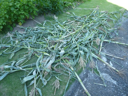 前回収穫しましたトウモロコシを抜き取りました。発令されている高温注意報の強い陽射しは茎の水分を奪い去り干からびていきます。もそっと干からびさせて粉砕後、発酵させ堆肥とし大地に戻します。