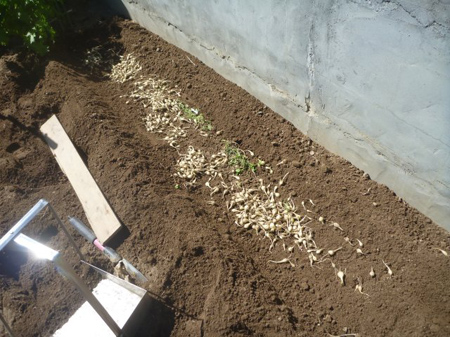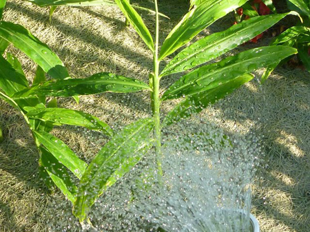 水分蒸発を防ぐに刈り取りました芝を敷き藁にしてありますが、乾燥は否めません。水が好きな生姜に灌水をします。