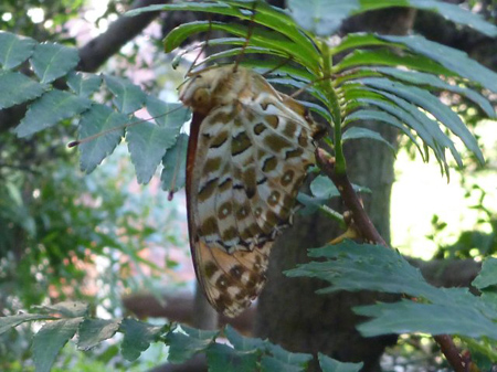 地球温暖化の指標、ツマグロヒョウモンチョウが山椒の葉裏で今宵の宿と羽根を休めていました。