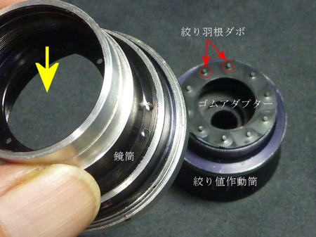 鏡筒を被せるときに絞り値作動筒にあります絞り値作動軸ネジ穴が鏡筒側の開放位置と合わせる必要があります。