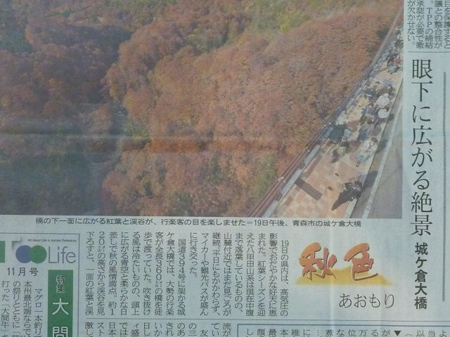 地元紙東奥日報一面に上空からの城ヶ倉大橋紅葉の状況を伝えていました。