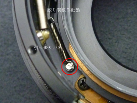 絞り羽根作動盤に引っ張りバネが取り付けられています。赤○部のネジを外してバネ力量を逃がします。