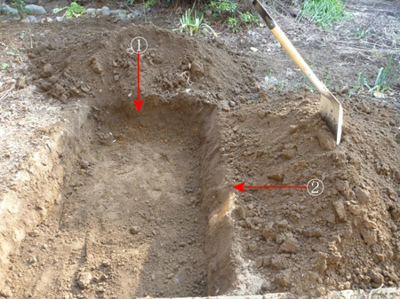 隠居人ですから体力的に広く作業は出来ません。最初に除いた表土赤矢印①を戻し、深部の赤矢印②を表土といたし改良していきます。