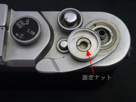 レリ-ズ釦環を外します。赤丸①と②のネジを外します。