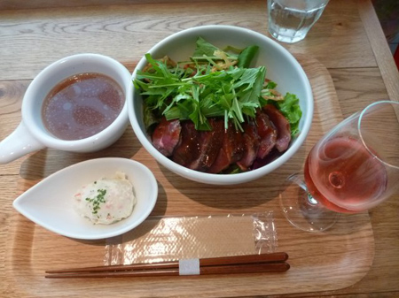 思えば六本木アークヒルズは仕事場なのですね。昼食時はランチのみ。若き女性が過半数を占め仕事に差し支えない量のロゼが付随しています。優雅に一時を過ごしたかったのですが、牛ステーキのジンジャーBBQソース丼を注文。漱石1枚でした。