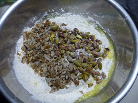 薄力粉400g・甜菜グラニュー糖200g・ベーキングパウダー5gをビニール袋の中で攪拌後、Mサイズ全卵3個にバニラオイルを数滴垂らしブレンダーで攪拌してから鬼胡桃140gとピスタチオ50gを加えて練り込みます。一次焼きの際、クッキングシート上に振る分量外の小麦粉が必要です。甘さは、好みで甜菜グラニュー糖を増減します。
