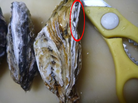牡蠣剥きナイフの持ち合わせがありません。簡易的にキッチン鋏で合わせ目をチョキチョキすると穴が空きます。