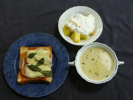 冷やしトマトは美味しいですね!プランター栽培のタイバジルを載せピザトーストにし、娘が仕込んだクラムチャウダーでガッツリの朝食です。少しばかりカロリーが高すぎますでしょうか?