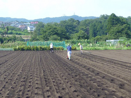 畝間20cmをトンボで曳き、種まき権兵衛で播種します。20アールの畑は一往復が限度。