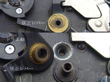 この係止レバーが働かないと巻き上げた時にドラム軸が係止されずシャター幕が戻ってしまいます。ですから「おかしい!おかしい!」と何度も巻き上げたのでしょう。