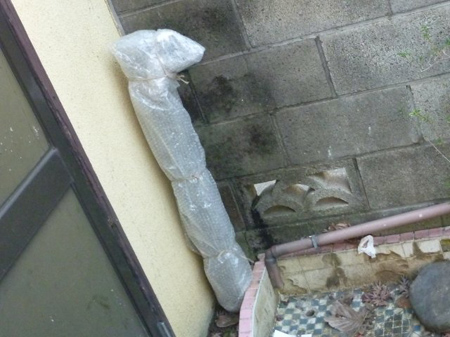 勝手は筵を利用しましたが、時代ですね!外水道の凍結防止にエアーパッキンで菰巻きをいたします。