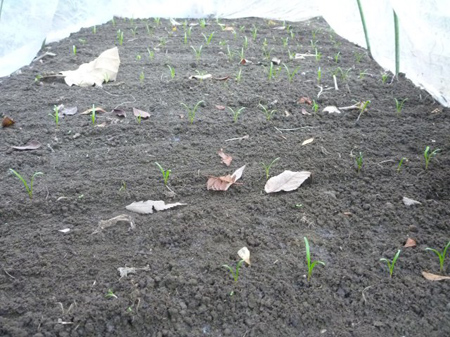 ビニールトンネルに保護されてちりちりほうれん草が萌芽しておりました。