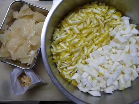 種とアルベド(内果皮)にはペクチン(食物繊維)が豊富なのですね。外見の割に果実部分は少なく堅目の仕上がりです。それと鬼柚特有の風味があります。