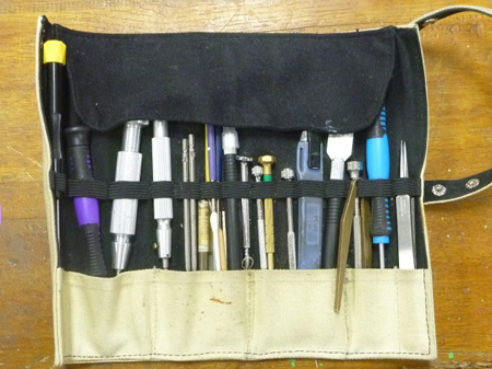 参加者が妹さんより戴いたお洒落な工具袋を使用していました。必要な工具が一目瞭然であり持ち歩きに良しですね。ブランド名はDELFONICS。本人は化粧筆収納と話されていましたが文具店の商品でした。工具メーカーでも同じような商品がありますが、チョイト大きいようです。