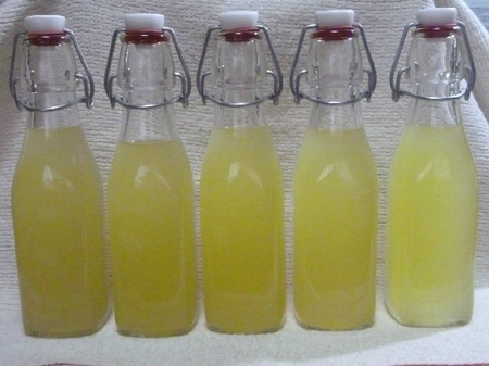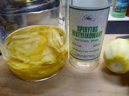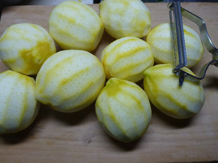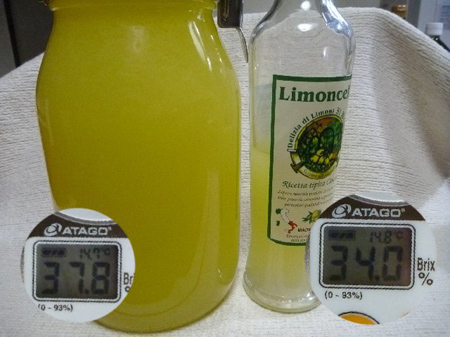 シロップが冷めましたら投入。買い置きしてありますイタリア産リモンチェッロの糖度は34度、自作は37.8度でおおむね近似値ですね。