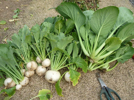 小松菜は塔立ち間際であり蕪は聖護院蕪と見間違う大きさでした。
